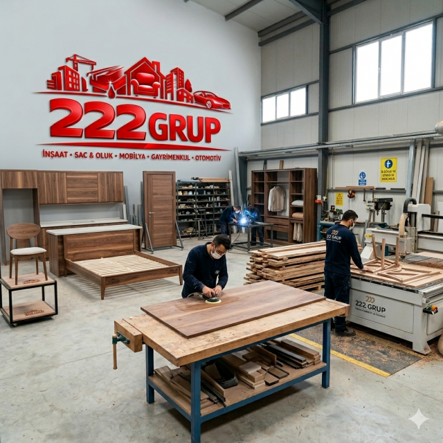 "222 Grup" olarak, Eskişehir'deki modern ve tam donanımlı üretim tesisimizde, mobilya üretiminin her aşamasını titizlikle yönetiyoruz. Bu görsel, mobilya ve tasarım konusundaki uzmanlığımızı, ileri teknoloji makine parkurumuzu (CNC router dahil) ve usta ellerdeki zanaatkarlığımızı yansıtmaktadır.